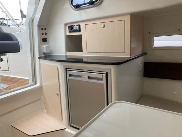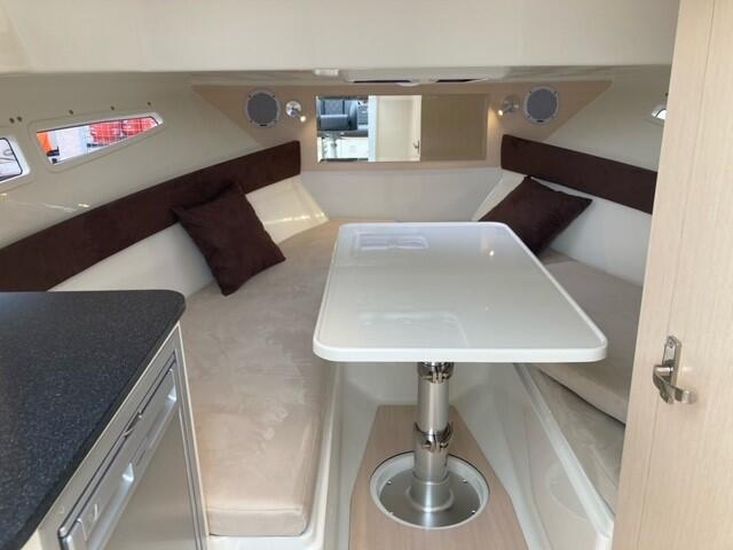 The Atlantic 730 is powered by a 350 Mercruiser Outboard petrol engine with a top speed of around 45 knots. Excellent performance and economy. The 730 also features a bow thruster for easy manoeuvring in tight spaces. The 730 is equipped with a comprehensive electronics package including a Raymarine GPS/Plotter, VHF radio and stereo system. The 730 also features a full wet bar with sink, fridge and storage.