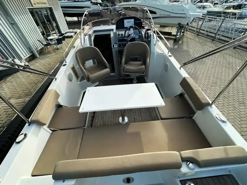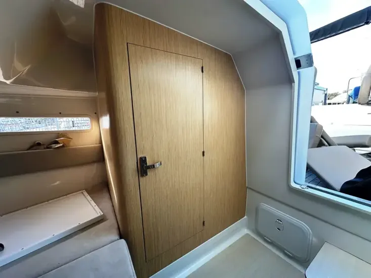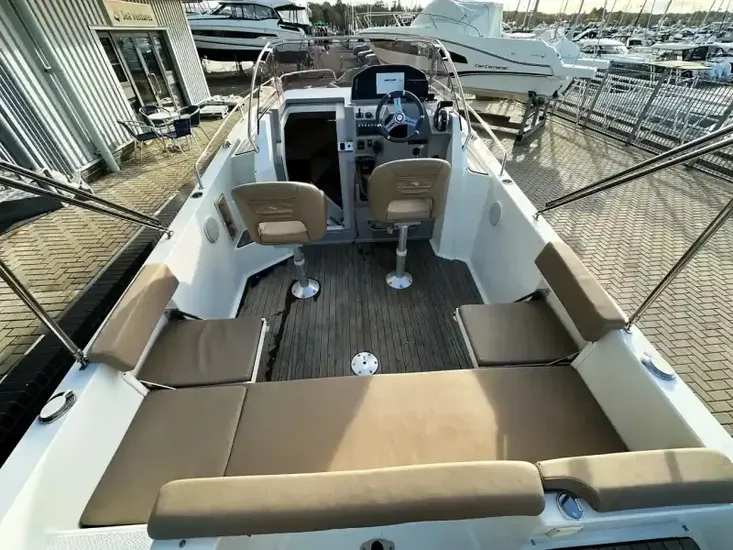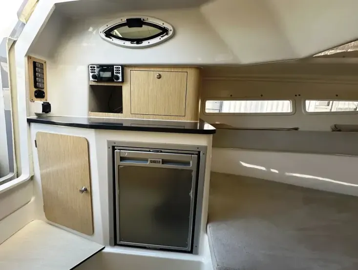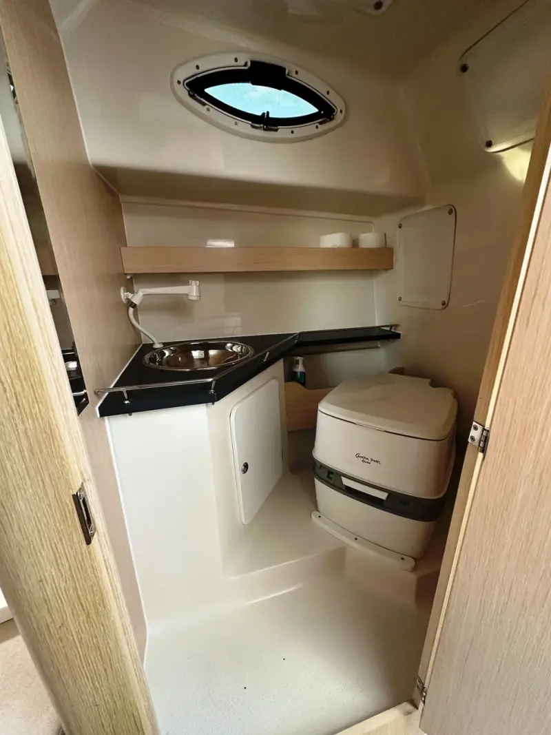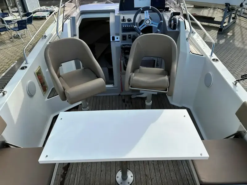 The Atlantic Marine 730 Sun Cruiser is the flagship of the cabin line, offering exceptional comfort and functionality. Its spacious cabin accommodates up to 3 people, providing a cozy retreat for rest and overnight stays during extended cruises. The cabin has a lockable bathroom with a sink and shower, with the option to install a marine