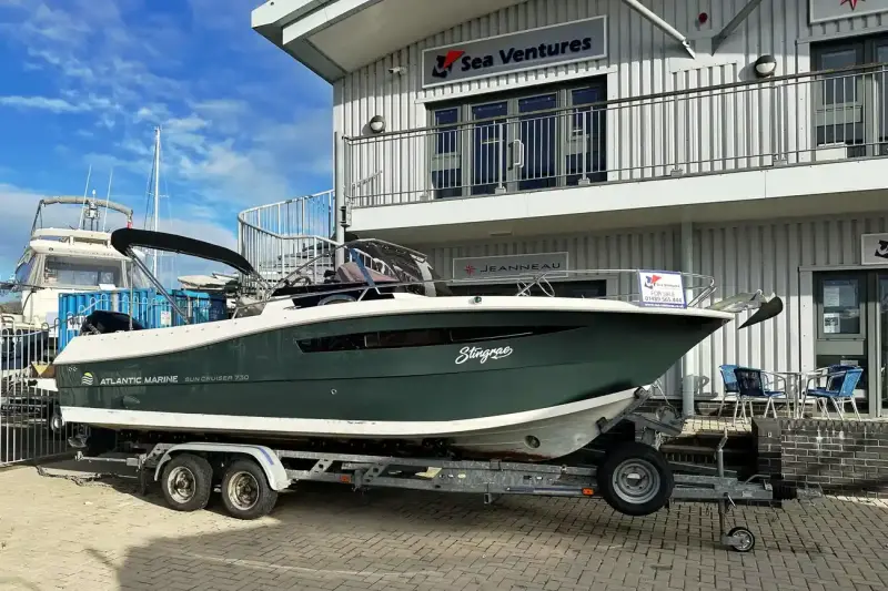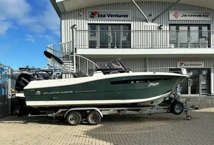The Atlantic Marine 730 Sun Cruiser is a 7.7-meter walk-around cabin boat designed for day cruising and overnight trips, featuring a spacious sun deck, a convertible cockpit seating area, and a cabin with two berths and a separate heads compartment.