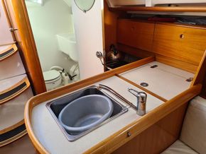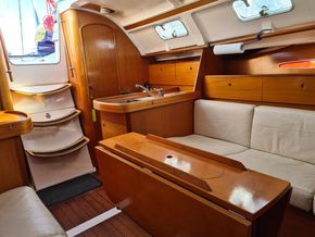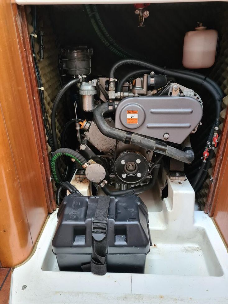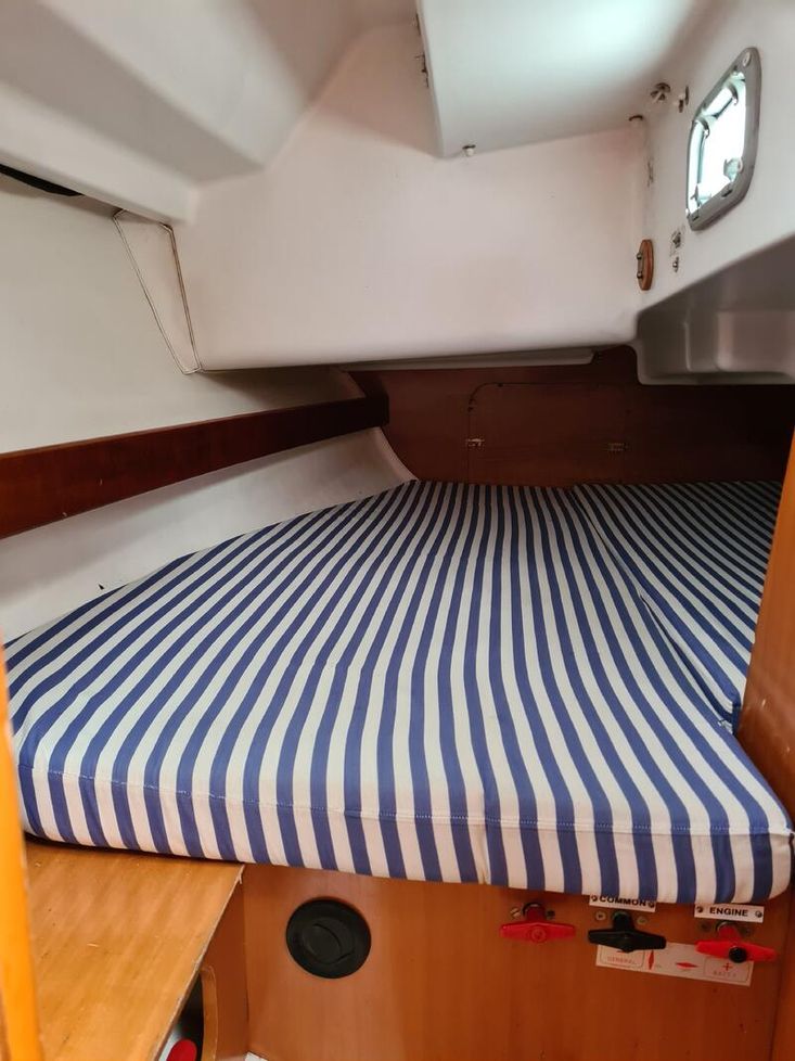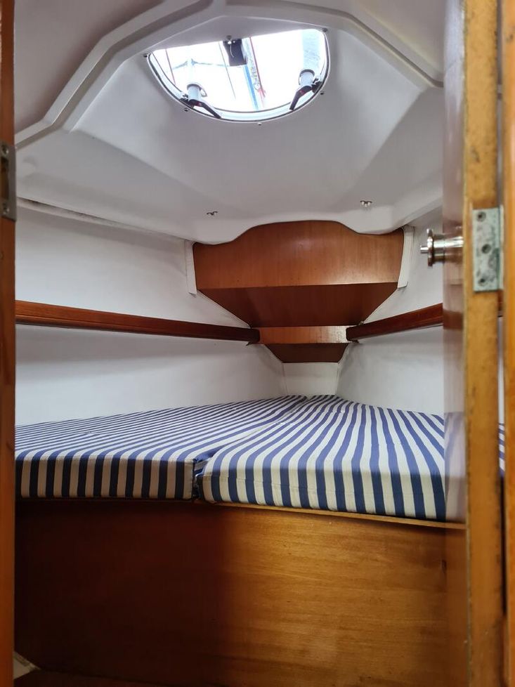 Two cabin 'Owners' version, sleeps 6 in 2 cabins and saloon. Cabin cushions upholstered in standard blue/white stripped cloth. Saloon cushions are standard cream leatherette. Saloon berths have fitted lee cloths. Webasto hot air heating to saloon, cabins and heads.
